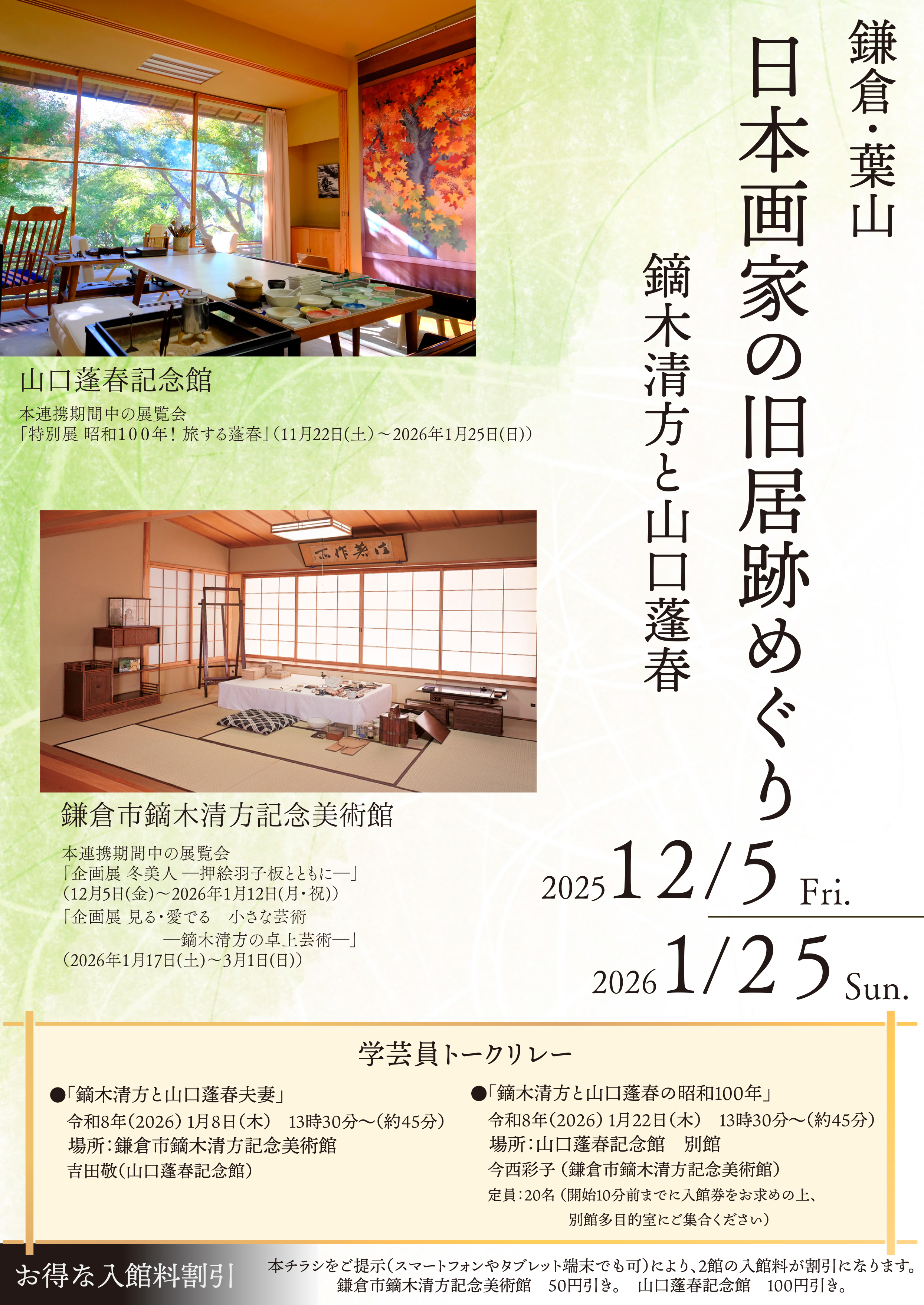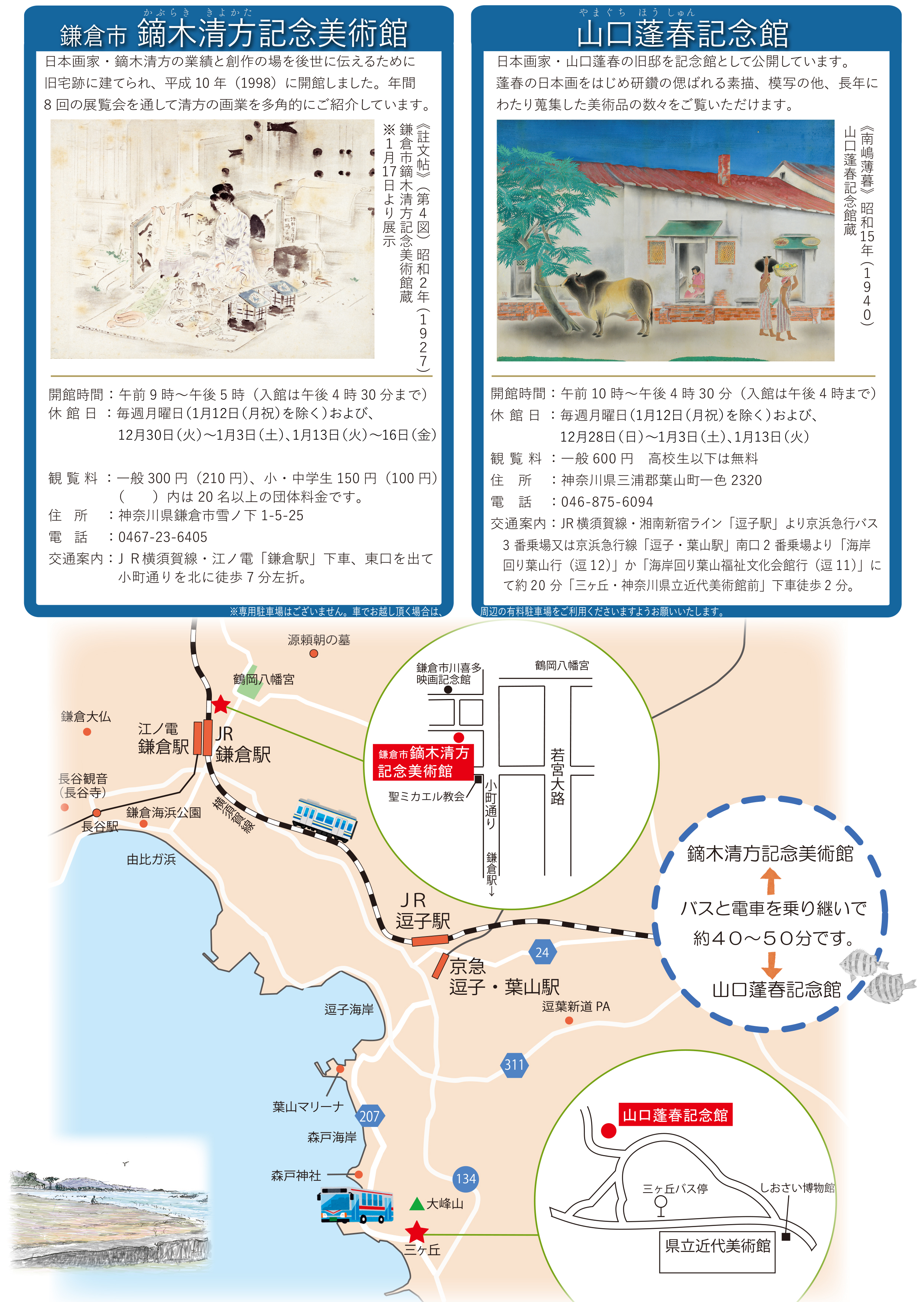 内 容 日本画家同士、親交があった山口蓬春と鏑木清方。葉山と鎌倉にある記念美術館が企画を連携開催いたします。
