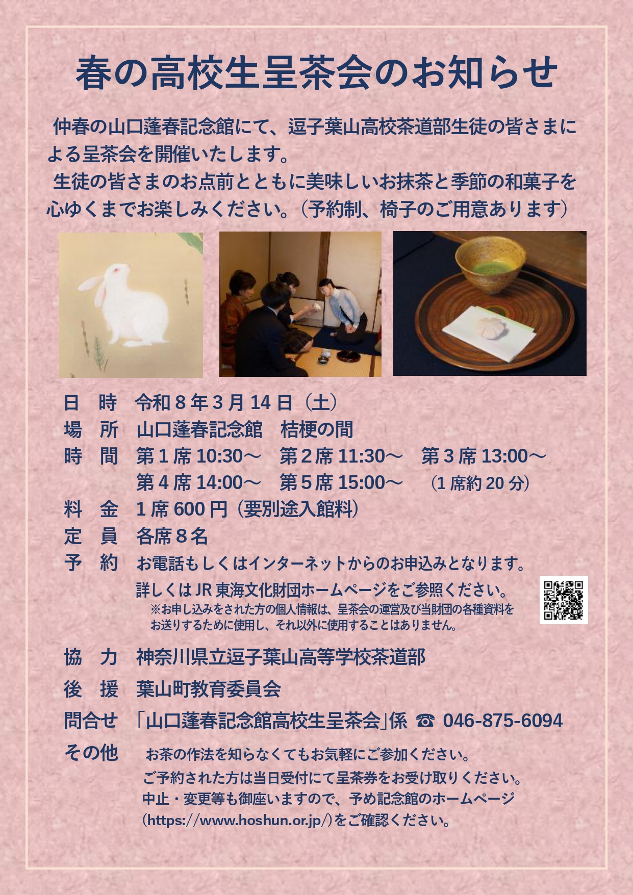 内 容 神奈川県立逗子葉山高校茶道部の生徒の皆様によるお点前を旧山口邸の佇まいとともにお楽しみください。
