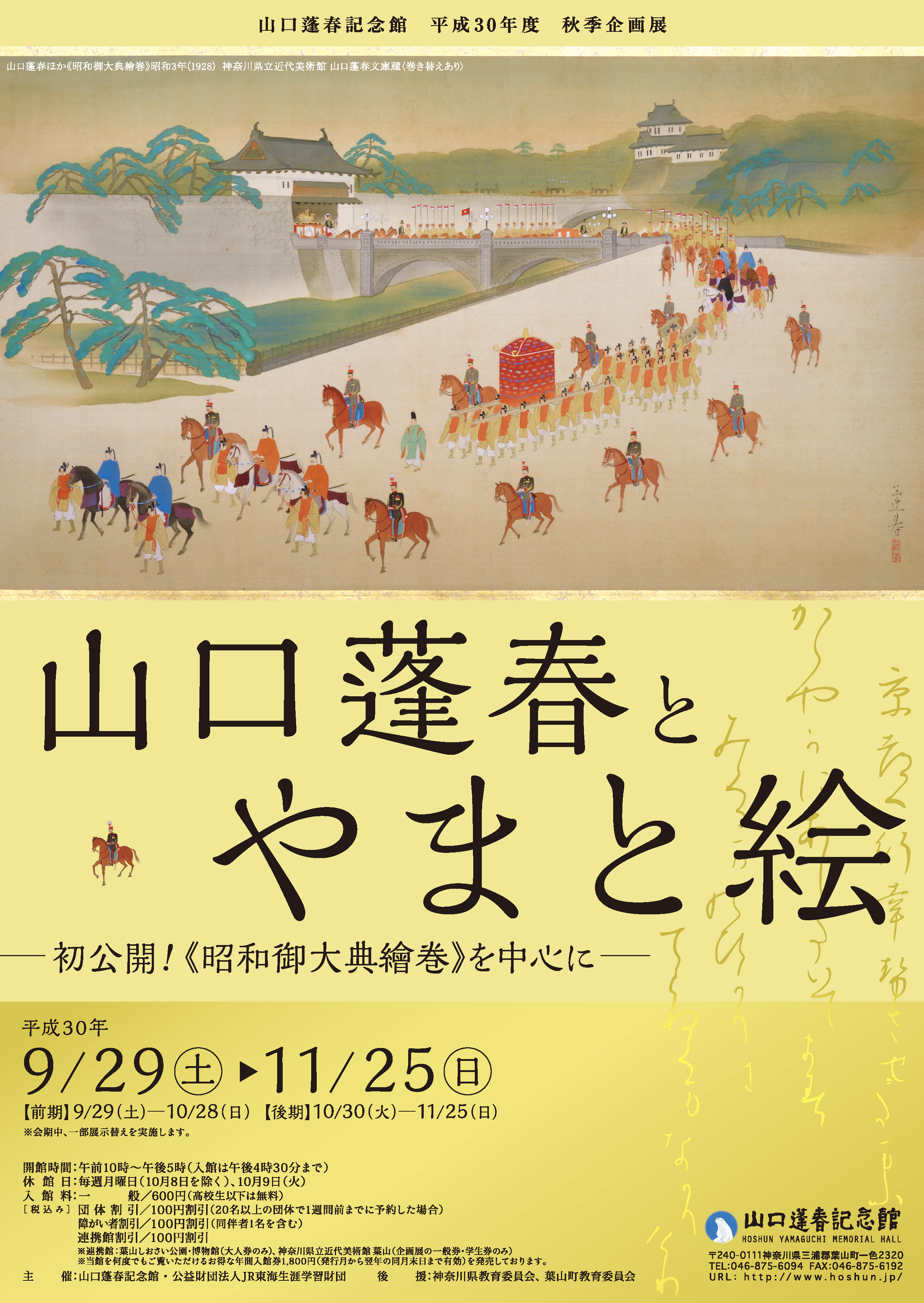 この度、初公開となる《昭和御大典繪巻》(昭和3年、神奈川県立近代美術館 山口蓬春文庫蔵)は、蓬春をはじめ当時のやまと絵の名手たちが昭和天皇の「即位の礼」を描いたもので、やまと絵の魅力がふんだんに盛り込まれた一級品です。